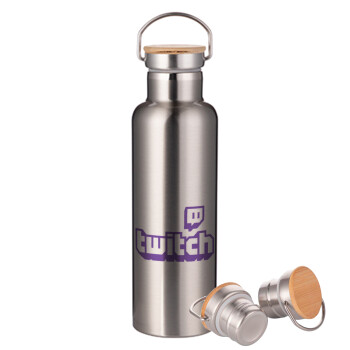 Twitch, Μεταλλικό παγούρι θερμός (Stainless steel) Ασημένιο με ξύλινο καπακι (bamboo), διπλού τοιχώματος, 750ml