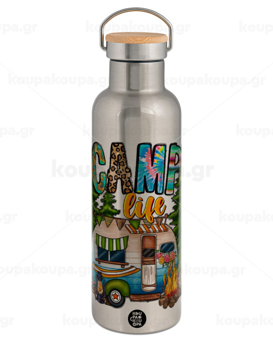 Camp Life, Μεταλλικό παγούρι θερμός (Stainless steel) Ασημένιο με ξύλινο καπακι (bamboo), διπλού τοιχώματος, 750ml