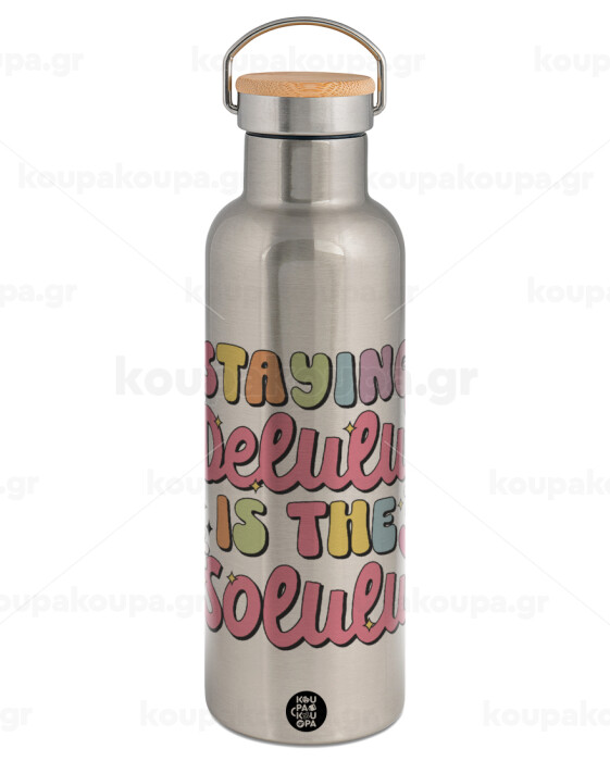 Delulu, Μεταλλικό παγούρι θερμός (Stainless steel) Ασημένιο με ξύλινο καπακι (bamboo), διπλού τοιχώματος, 750ml