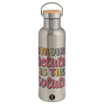 Delulu, Μεταλλικό παγούρι θερμός (Stainless steel) Ασημένιο με ξύλινο καπακι (bamboo), διπλού τοιχώματος, 750ml