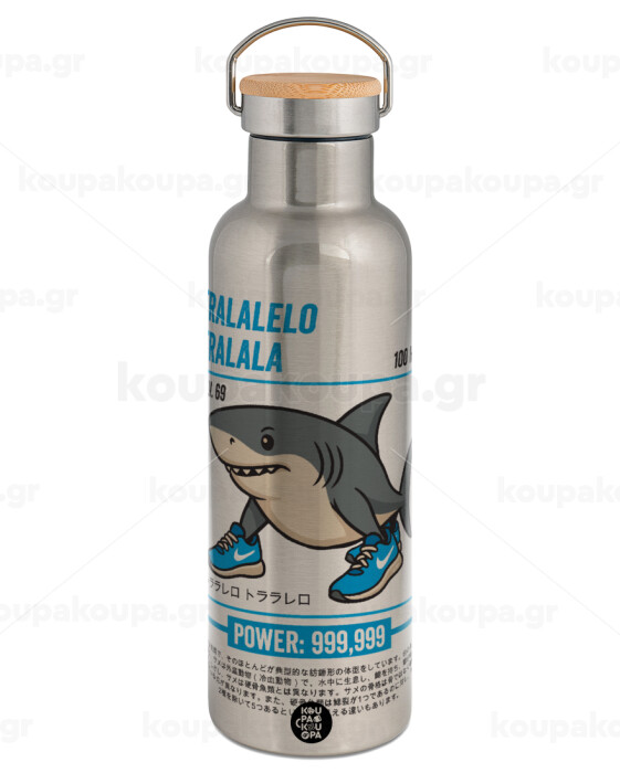 Tralalero Tralala, Μεταλλικό παγούρι θερμός (Stainless steel) Ασημένιο με ξύλινο καπακι (bamboo), διπλού τοιχώματος, 750ml
