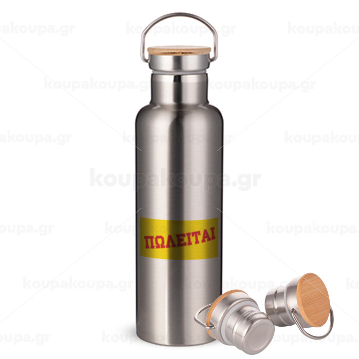 ΠΩΛΕΙΤΑΙ, Μεταλλικό παγούρι θερμός (Stainless steel) Ασημένιο με ξύλινο καπακι (bamboo), διπλού τοιχώματος, 750ml
