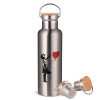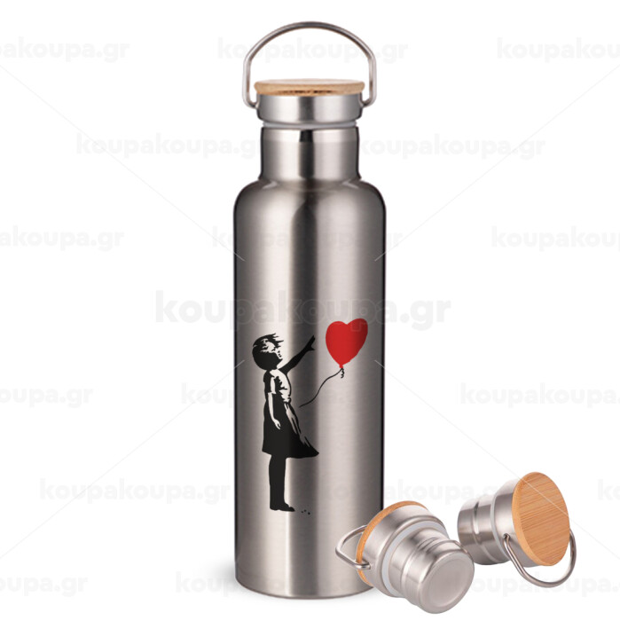 Banksy (Hope), Μεταλλικό παγούρι θερμός (Stainless steel) Ασημένιο με ξύλινο καπακι (bamboo), διπλού τοιχώματος, 750ml