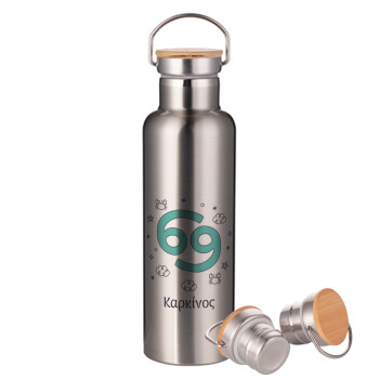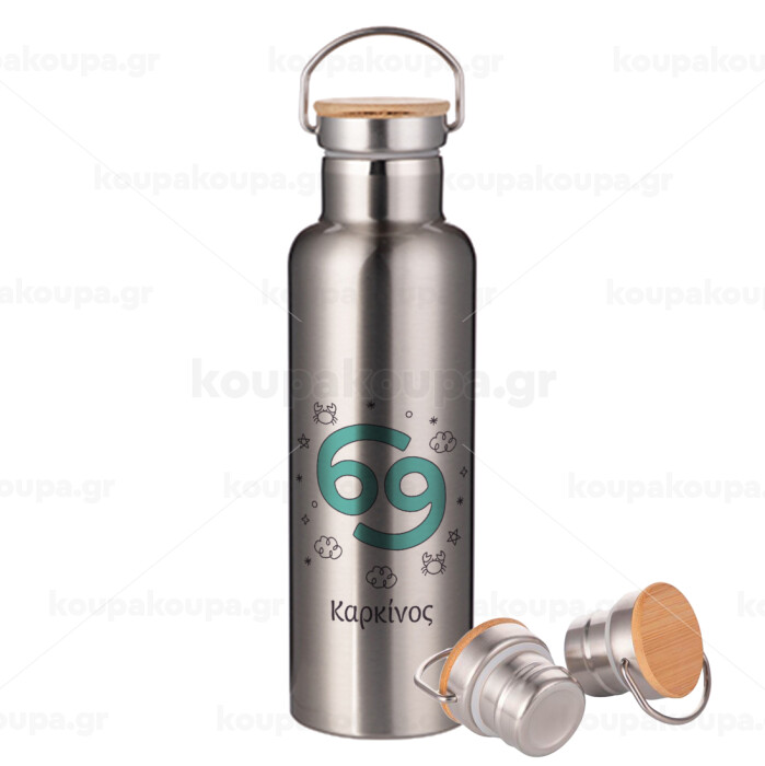 Ζώδια Καρκίνος, Μεταλλικό παγούρι θερμός (Stainless steel) Ασημένιο με ξύλινο καπακι (bamboo), διπλού τοιχώματος, 750ml
