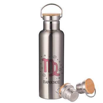 Ζώδια Παρθένος, Μεταλλικό παγούρι θερμός (Stainless steel) Ασημένιο με ξύλινο καπακι (bamboo), διπλού τοιχώματος, 750ml
