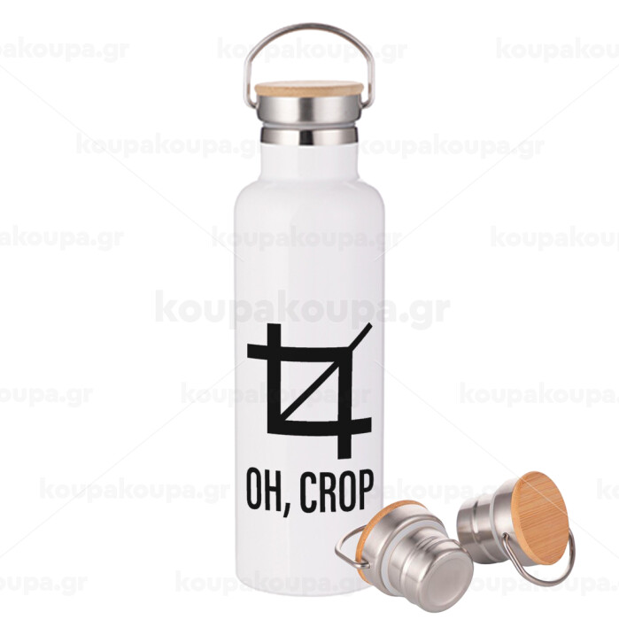 Oh Crop, Μεταλλικό παγούρι θερμός (Stainless steel) Λευκό με ξύλινο καπάκι (bamboo), διπλού τοιχώματος, 750ml