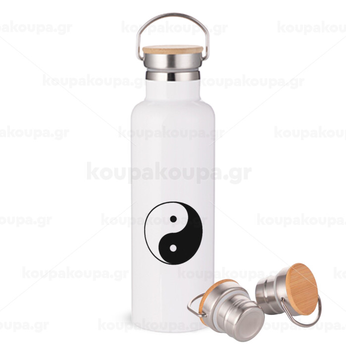 Yin Yang, Μεταλλικό παγούρι θερμός (Stainless steel) Λευκό με ξύλινο καπάκι (bamboo), διπλού τοιχώματος, 750ml