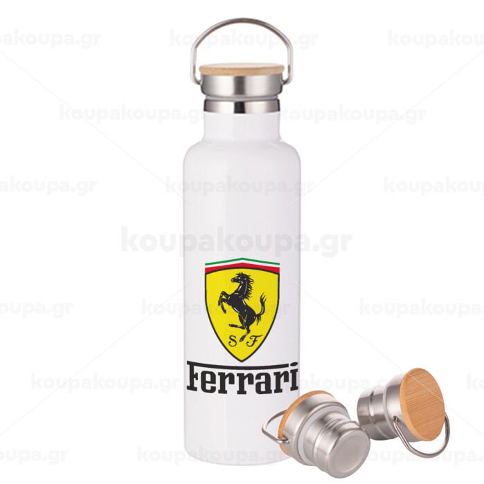 Ferrari S.p.A., Μεταλλικό παγούρι θερμός (Stainless steel) Λευκό με ξύλινο καπάκι (bamboo), διπλού τοιχώματος, 750ml