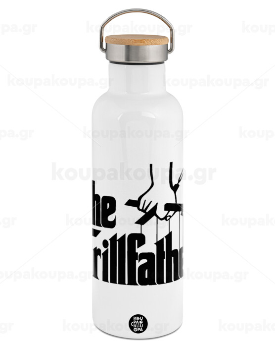 The Grill Father, Μεταλλικό παγούρι θερμός (Stainless steel) Λευκό με ξύλινο καπάκι (bamboo), διπλού τοιχώματος, 750ml