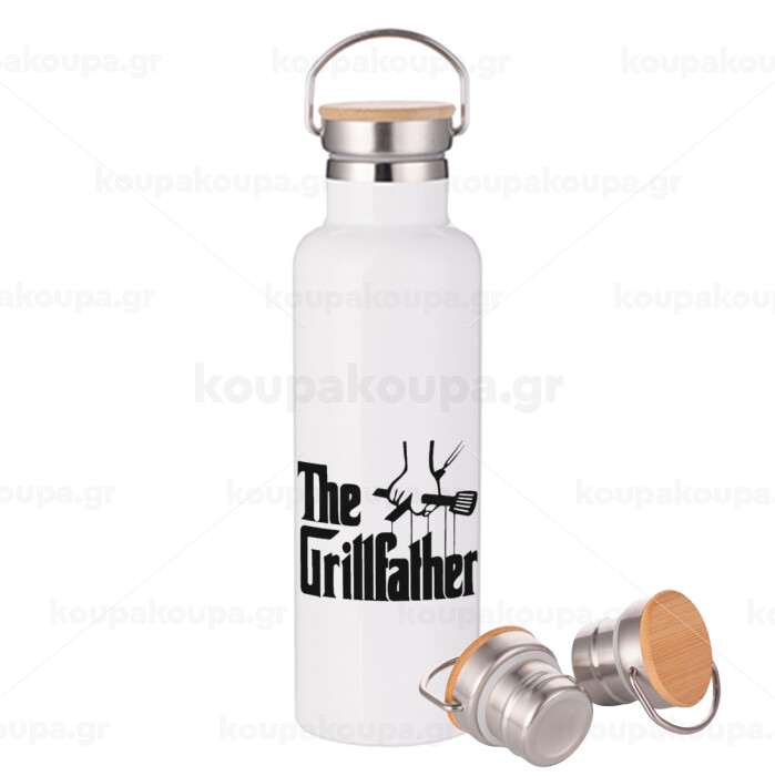 The Grillfather, Μεταλλικό παγούρι θερμός (Stainless steel) Λευκό με ξύλινο καπάκι (bamboo), διπλού τοιχώματος, 750ml