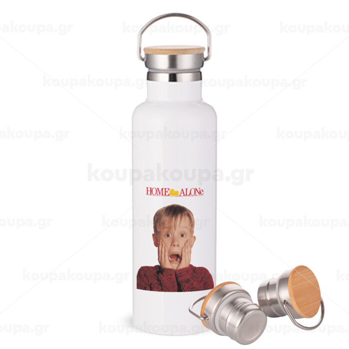 Μόνος στο σπίτι Kevin McCallister Shocked, Μεταλλικό παγούρι θερμός (Stainless steel) Λευκό με ξύλινο καπάκι (bamboo), διπλού τοιχώματος, 750ml