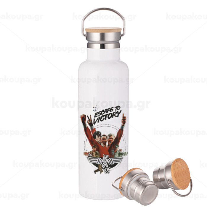 Escape to victory, Μεταλλικό παγούρι θερμός (Stainless steel) Λευκό με ξύλινο καπάκι (bamboo), διπλού τοιχώματος, 750ml