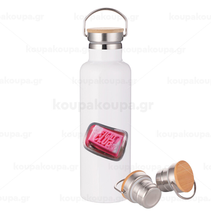 Fight Club, Μεταλλικό παγούρι θερμός (Stainless steel) Λευκό με ξύλινο καπάκι (bamboo), διπλού τοιχώματος, 750ml