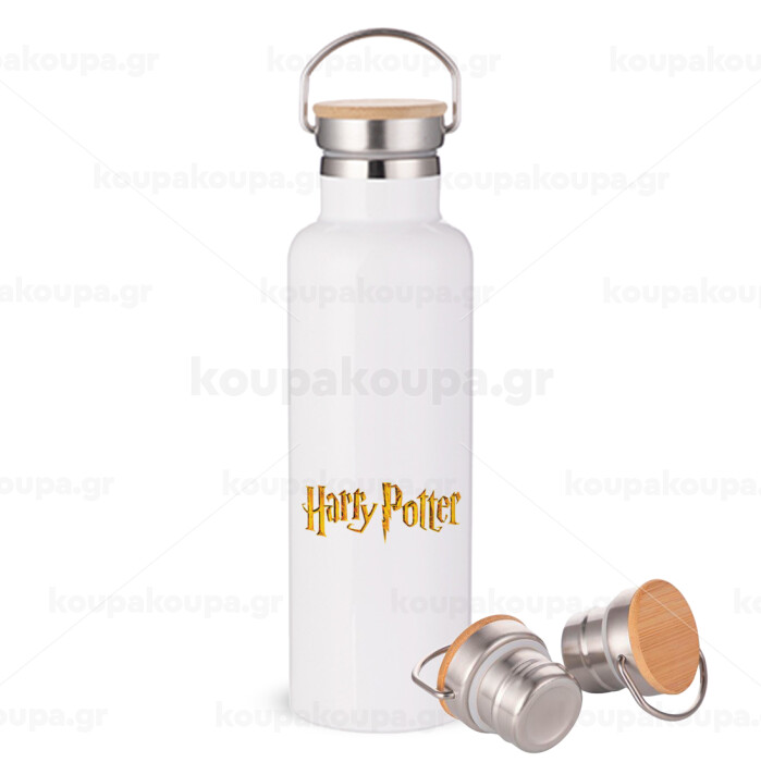 Harry potter movie, Μεταλλικό παγούρι θερμός (Stainless steel) Λευκό με ξύλινο καπάκι (bamboo), διπλού τοιχώματος, 750ml