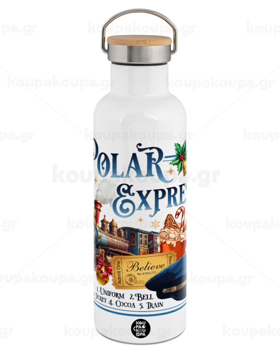 The Polar Express, Μεταλλικό παγούρι θερμός (Stainless steel) Λευκό με ξύλινο καπάκι (bamboo), διπλού τοιχώματος, 750ml