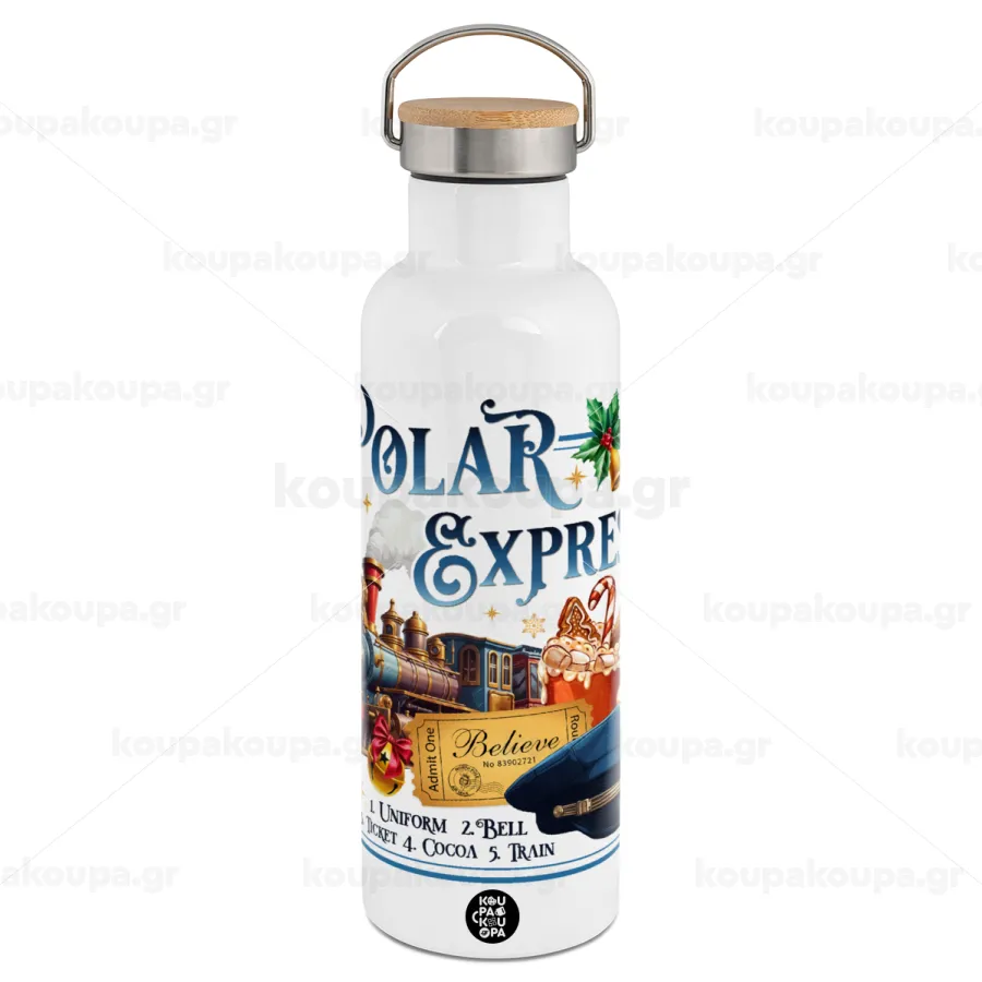 The Polar Express, Μεταλλικό παγούρι θερμός (Stainless steel) Λευκό με ξύλινο καπάκι (bamboo), διπλού τοιχώματος, 750ml