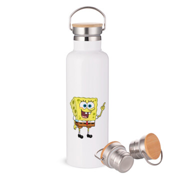 Μπομπ Σφουγγαράκης character, Μεταλλικό παγούρι θερμός (Stainless steel) Λευκό με ξύλινο καπάκι (bamboo), διπλού τοιχώματος, 750ml