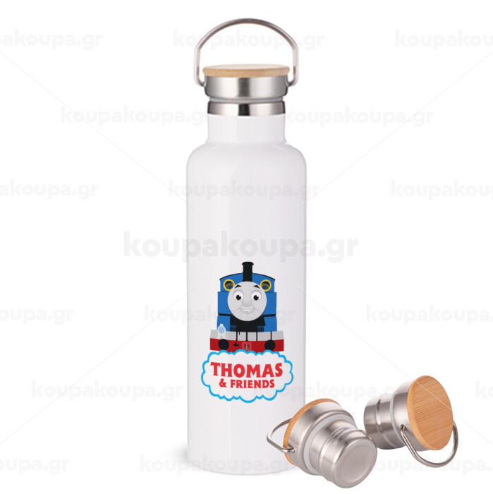 Τόμας το τρενάκι, Μεταλλικό παγούρι θερμός (Stainless steel) Λευκό με ξύλινο καπάκι (bamboo), διπλού τοιχώματος, 750ml