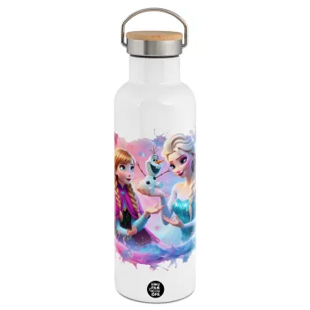 Έλσα & Άννα, Μεταλλικό παγούρι θερμός (Stainless steel) Λευκό με ξύλινο καπάκι (bamboo), διπλού τοιχώματος, 750ml