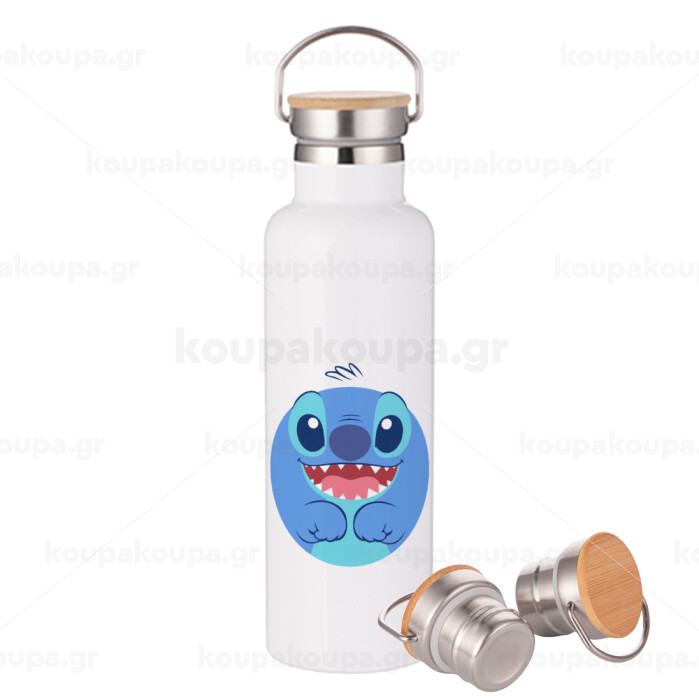 Lilo & Stitch blue, Μεταλλικό παγούρι θερμός (Stainless steel) Λευκό με ξύλινο καπάκι (bamboo), διπλού τοιχώματος, 750ml