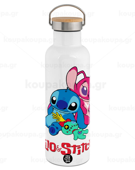 Lilo & Stitch, Μεταλλικό παγούρι θερμός (Stainless steel) Λευκό με ξύλινο καπάκι (bamboo), διπλού τοιχώματος, 750ml