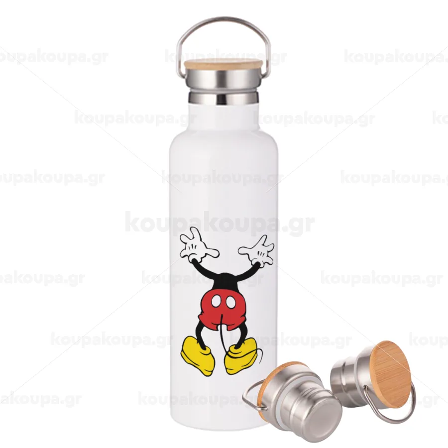 Mickey hide..., Μεταλλικό παγούρι θερμός (Stainless steel) Λευκό με ξύλινο καπάκι (bamboo), διπλού τοιχώματος, 750ml