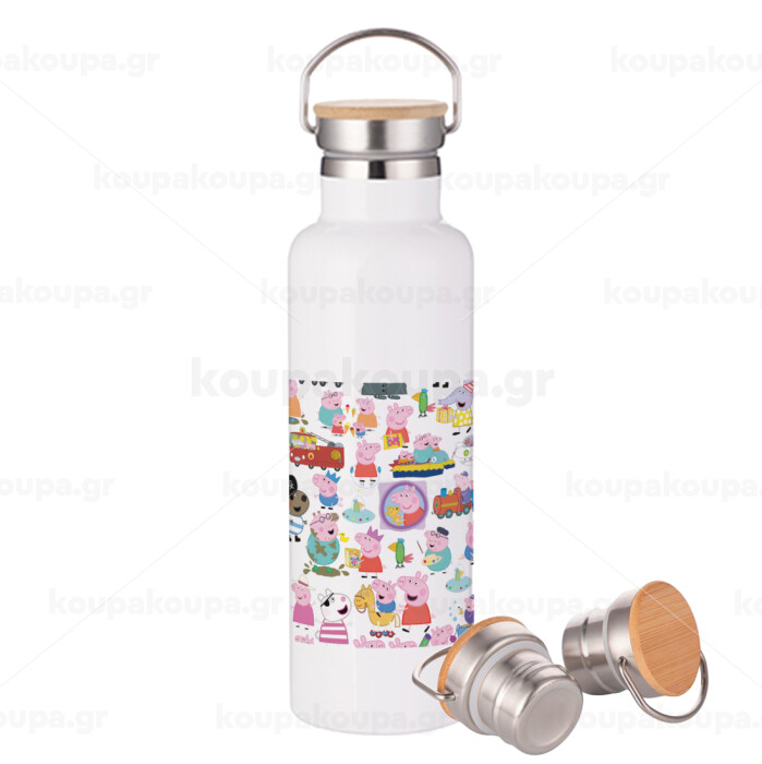 Peppa pig Characters, Μεταλλικό παγούρι θερμός (Stainless steel) Λευκό με ξύλινο καπάκι (bamboo), διπλού τοιχώματος, 750ml