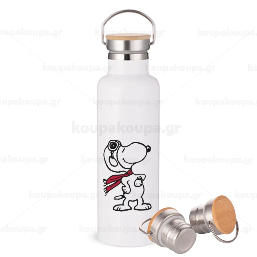 Snoopy ο πιλότος, Μεταλλικό παγούρι θερμός (Stainless steel) Λευκό με ξύλινο καπάκι (bamboo), διπλού τοιχώματος, 750ml
