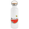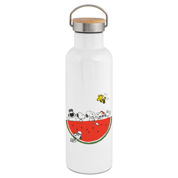 Snoopy summer, Μεταλλικό παγούρι θερμός (Stainless steel) Λευκό με ξύλινο καπάκι (bamboo), διπλού τοιχώματος, 750ml