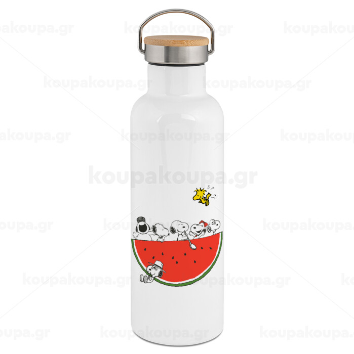 Snoopy summer, Μεταλλικό παγούρι θερμός (Stainless steel) Λευκό με ξύλινο καπάκι (bamboo), διπλού τοιχώματος, 750ml