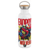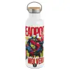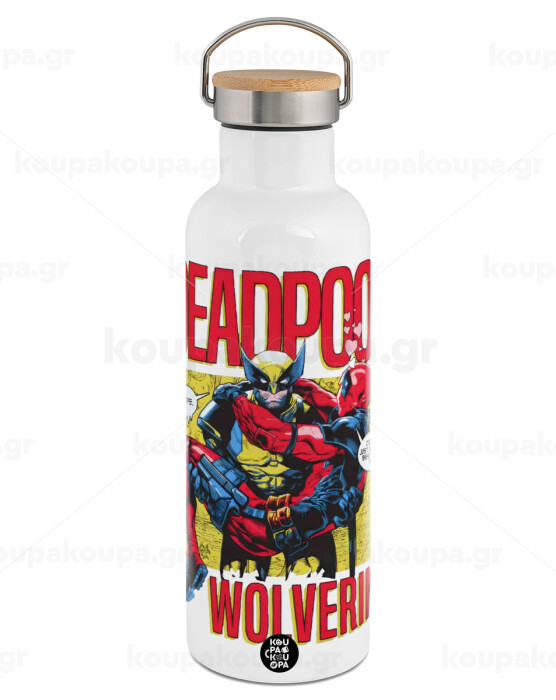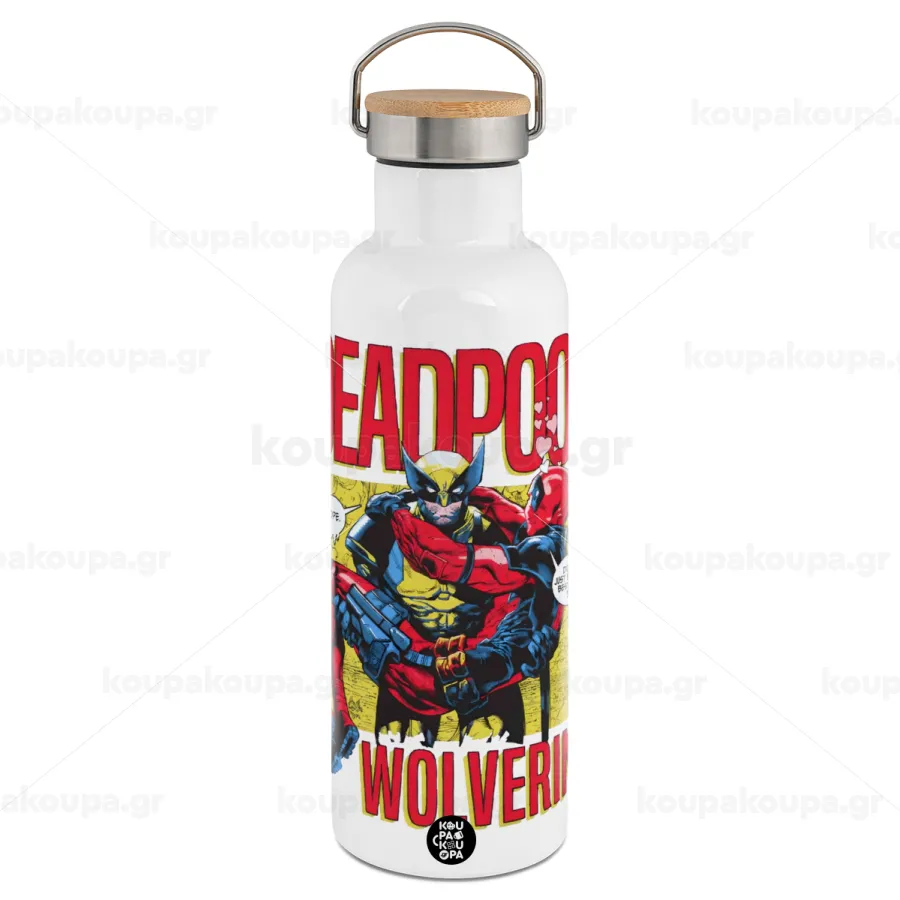 Superhero Deadpool Wolverine, Μεταλλικό παγούρι θερμός (Stainless steel) Λευκό με ξύλινο καπάκι (bamboo), διπλού τοιχώματος, 750ml