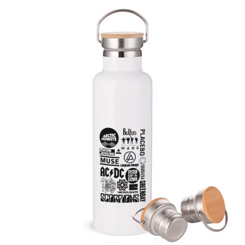 Best Rock Bands Collection, Μεταλλικό παγούρι θερμός (Stainless steel) Λευκό με ξύλινο καπάκι (bamboo), διπλού τοιχώματος, 750ml