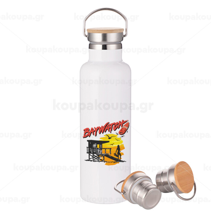 Baywatch, Μεταλλικό παγούρι θερμός (Stainless steel) Λευκό με ξύλινο καπάκι (bamboo), διπλού τοιχώματος, 750ml