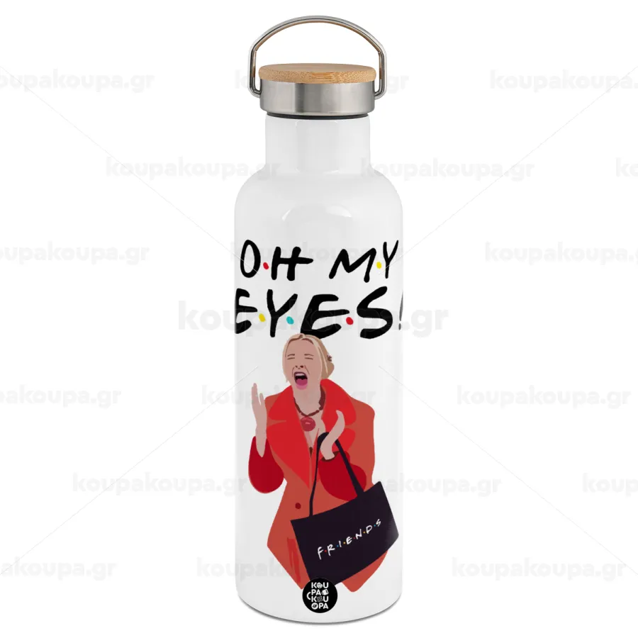 Friends,. oh my eyes Phoebe, Μεταλλικό παγούρι θερμός (Stainless steel) Λευκό με ξύλινο καπάκι (bamboo), διπλού τοιχώματος, 750ml