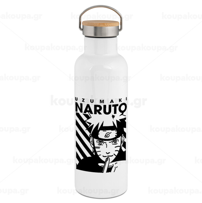 Naruto uzumaki, Μεταλλικό παγούρι θερμός (Stainless steel) Λευκό με ξύλινο καπάκι (bamboo), διπλού τοιχώματος, 750ml