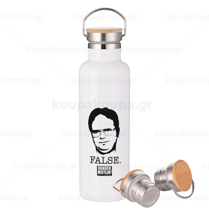 The office Dwight, Μεταλλικό παγούρι θερμός (Stainless steel) Λευκό με ξύλινο καπάκι (bamboo), διπλού τοιχώματος, 750ml