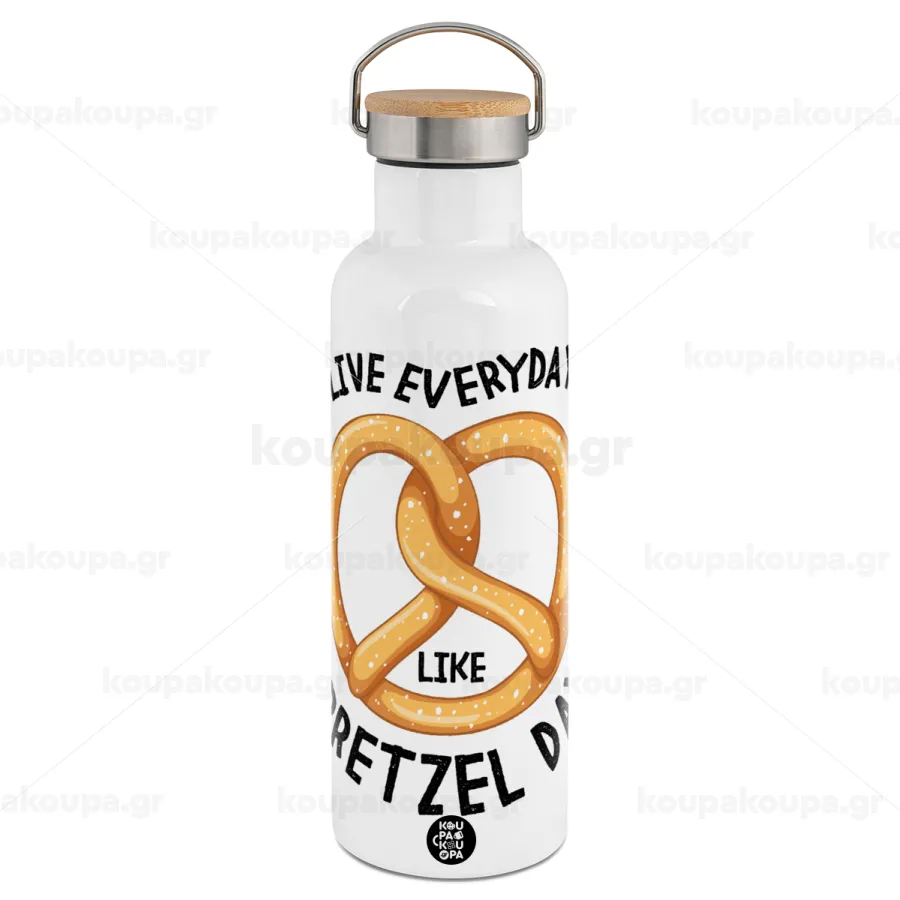 The office, Live every day like pretzel day, Μεταλλικό παγούρι θερμός (Stainless steel) Λευκό με ξύλινο καπάκι (bamboo), διπλού τοιχώματος, 750ml