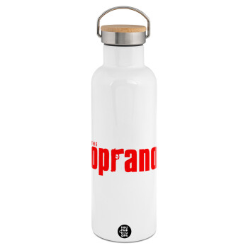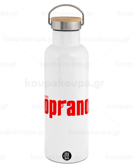 The Sopranos, Μεταλλικό παγούρι θερμός (Stainless steel) Λευκό με ξύλινο καπάκι (bamboo), διπλού τοιχώματος, 750ml