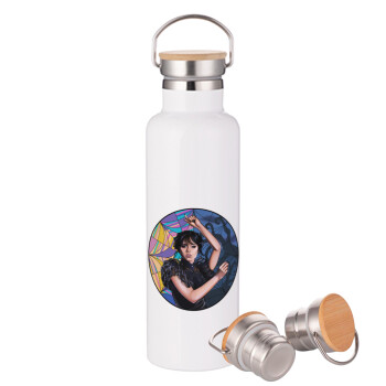 Wednesday dance, Μεταλλικό παγούρι θερμός (Stainless steel) Λευκό με ξύλινο καπάκι (bamboo), διπλού τοιχώματος, 750ml