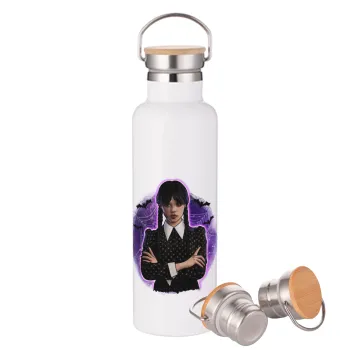 Wednesday moonlight, Μεταλλικό παγούρι θερμός (Stainless steel) Λευκό με ξύλινο καπάκι (bamboo), διπλού τοιχώματος, 750ml