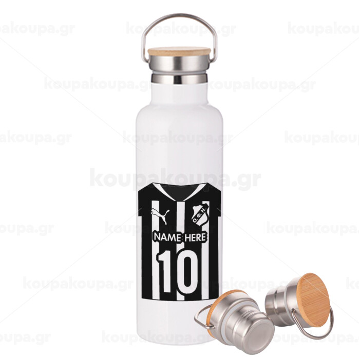 ΟΦΗ εμφάνιση, Μεταλλικό παγούρι θερμός (Stainless steel) Λευκό με ξύλινο καπάκι (bamboo), διπλού τοιχώματος, 750ml