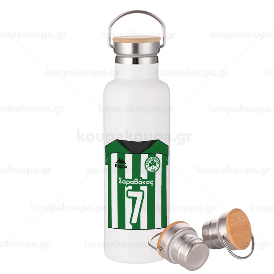 Παναθηναϊκός εμφάνιση, Μεταλλικό παγούρι θερμός (Stainless steel) Λευκό με ξύλινο καπάκι (bamboo), διπλού τοιχώματος, 750ml