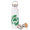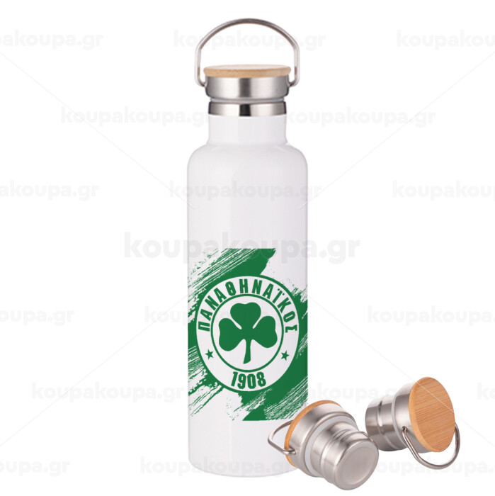Π.Α.Ο., Μεταλλικό παγούρι θερμός (Stainless steel) Λευκό με ξύλινο καπάκι (bamboo), διπλού τοιχώματος, 750ml