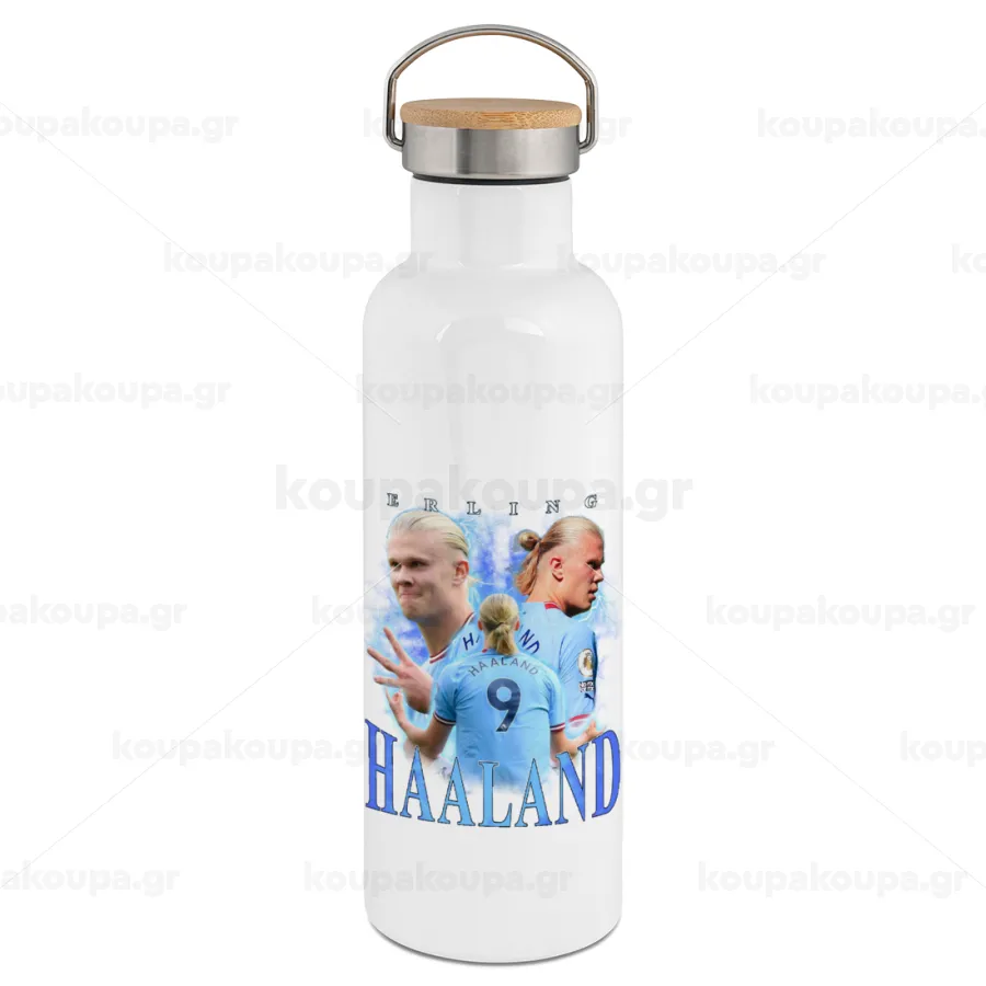 Erling Haaland, Μεταλλικό παγούρι θερμός (Stainless steel) Λευκό με ξύλινο καπάκι (bamboo), διπλού τοιχώματος, 750ml