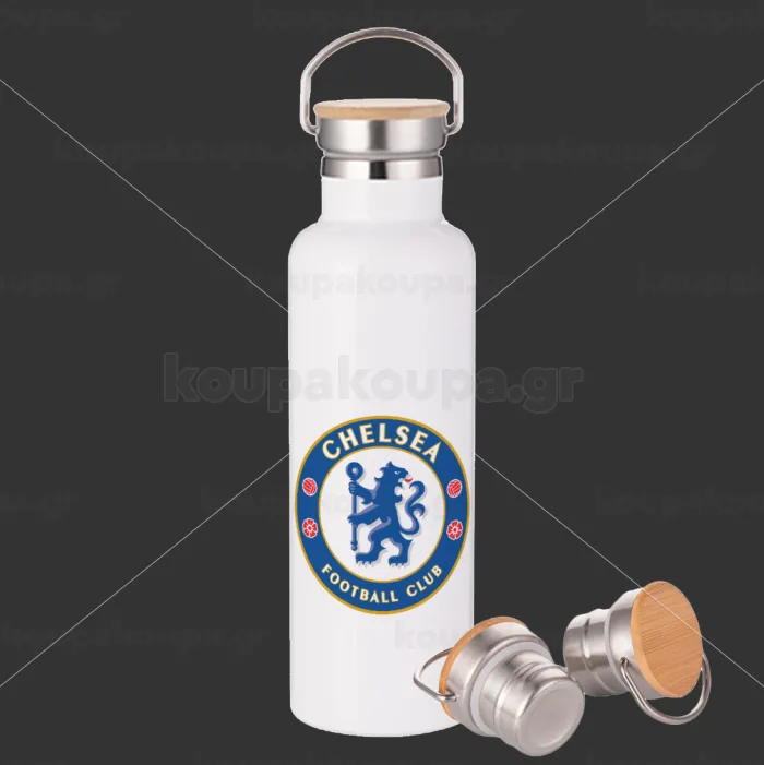FC Chelsea, Μεταλλικό παγούρι θερμός (Stainless steel) Λευκό με ξύλινο καπάκι (bamboo), διπλού τοιχώματος, 750ml