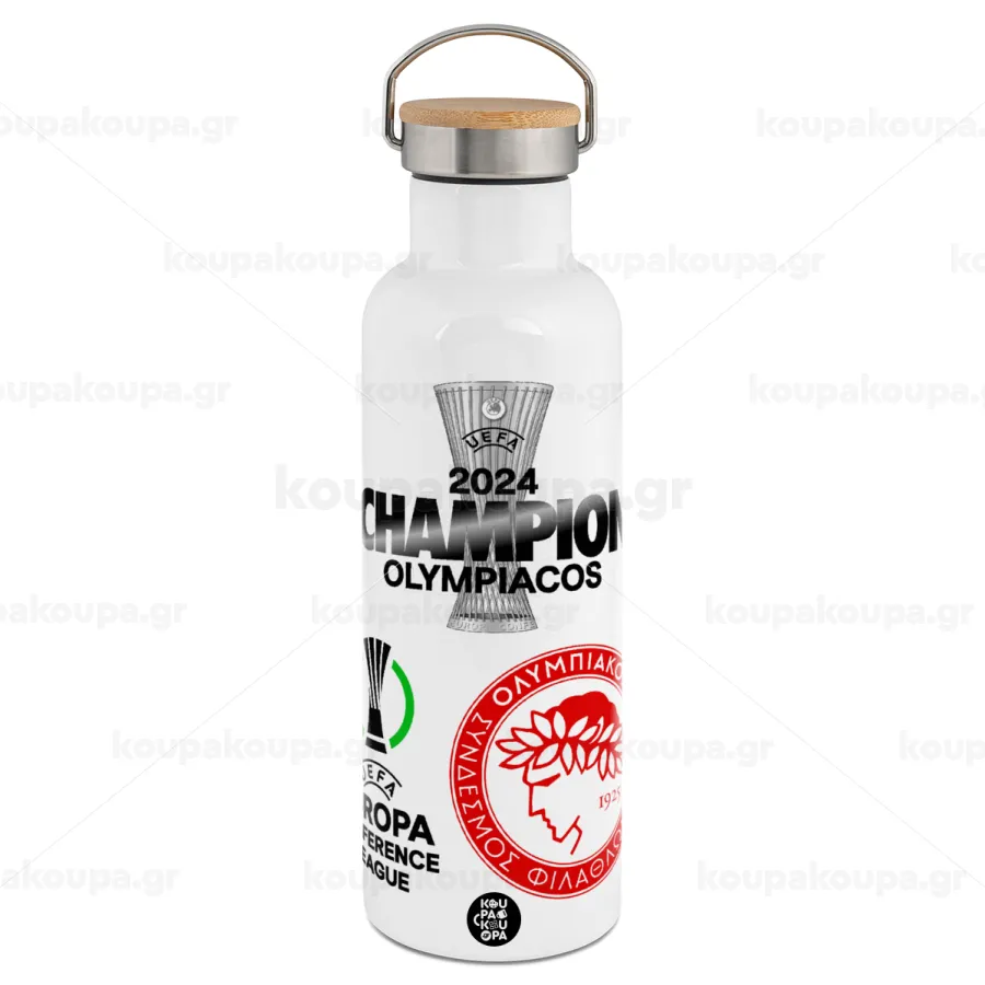 Olympiacos UEFA Europa Conference League Champion 2024, Μεταλλικό παγούρι θερμός (Stainless steel) Λευκό με ξύλινο καπάκι (bamboo), διπλού τοιχώματος, 750ml