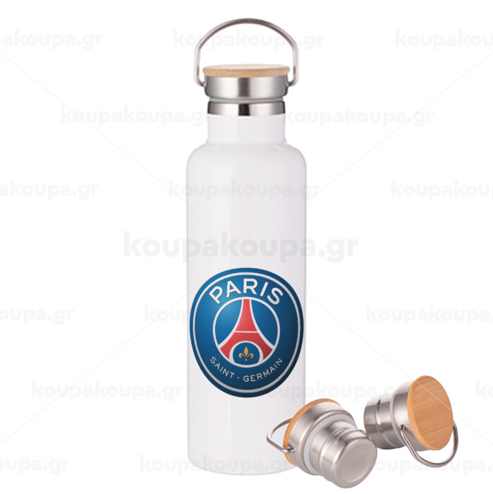 Paris Saint-Germain F.C., Μεταλλικό παγούρι θερμός (Stainless steel) Λευκό με ξύλινο καπάκι (bamboo), διπλού τοιχώματος, 750ml