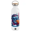 Stitch Basketball, Μεταλλικό παγούρι θερμός (Stainless steel) Λευκό με ξύλινο καπάκι (bamboo), διπλού τοιχώματος, 750ml