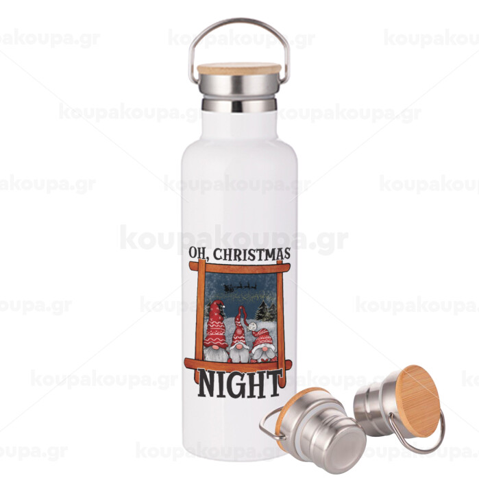 Oh Christmas Night, Μεταλλικό παγούρι θερμός (Stainless steel) Λευκό με ξύλινο καπάκι (bamboo), διπλού τοιχώματος, 750ml