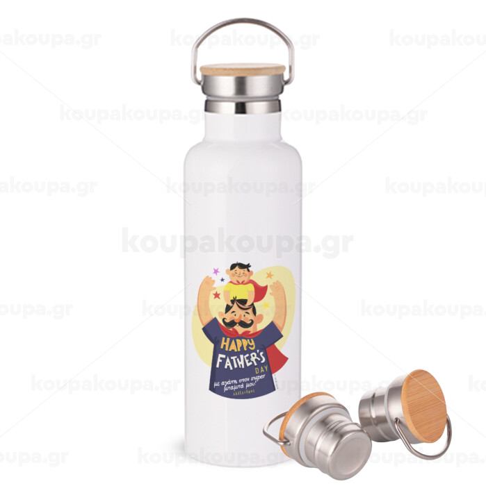 Happy Fathers Day με όνομα, Μεταλλικό παγούρι θερμός (Stainless steel) Λευκό με ξύλινο καπάκι (bamboo), διπλού τοιχώματος, 750ml